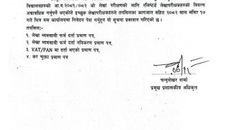 - अपा· परिचय पत्रको लागि जिल्ला महिला तथा वालवालिका कार्यालयबाट जारि गरिएको अपा·ता परिचय पत्र, नागरिकता वा जन्म दर्ता प्रमाण पत्र, पुर्ण अपा·को हकमा संरक्षक समेतको २ प्रति फोटो (सबै लाभ ग्राहीहरुको निवेदनसंग २÷२ प्रति फोटो अनिवार्य)