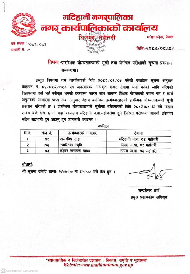 जनस्वास्थ्य अधिकृत पदको प्रारम्भिक योग्यताक्रमको सूची तथा लिखित परीक्षाको सूचना प्रकाशन सम्बन्धमा।