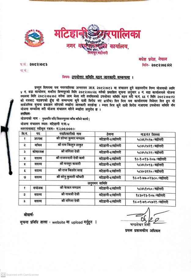 दुधमति नदि बिसनपुरमा बाँध बाध्ने कार्यको उपभोक्ता समिति गठन जानकारी सम्बन्धमा।