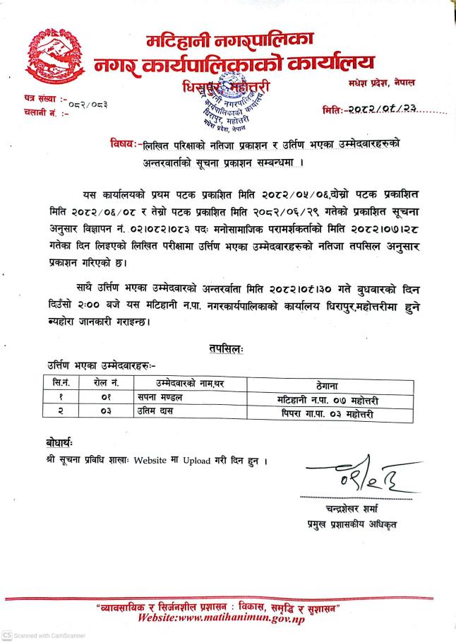» मनोसामाजिक परामर्शकर्ताको लिखित परीक्षाको नतिजा प्रकाशन र उतिर्ण भएका उम्मेदवारहरुको अन्तर्वार्ताको सूचना प्रकाशन सम्बन्धमा।