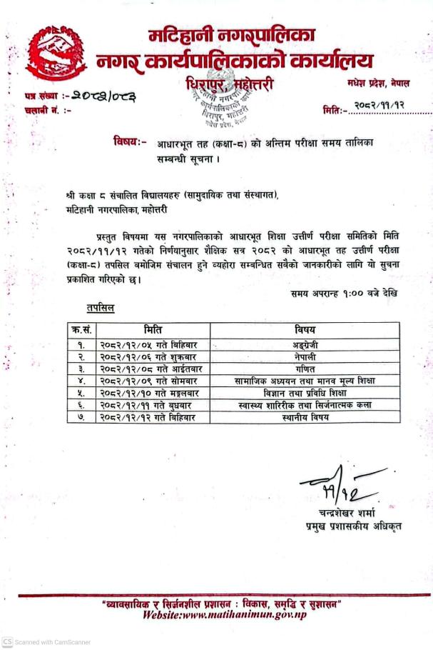आधारभूत तह (कक्षा-८) को अन्तिम परीक्षा समय तालिका सम्बन्धी सूचना ।