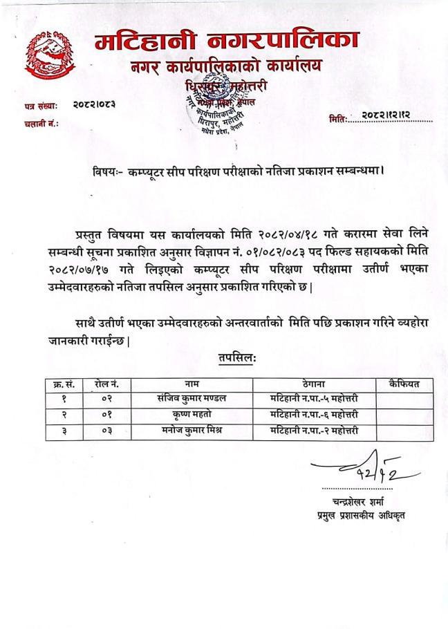 कम्प्यूटर सीप परीक्षण परीक्षाको नतिजा प्रकाशन सम्बन्धमा।