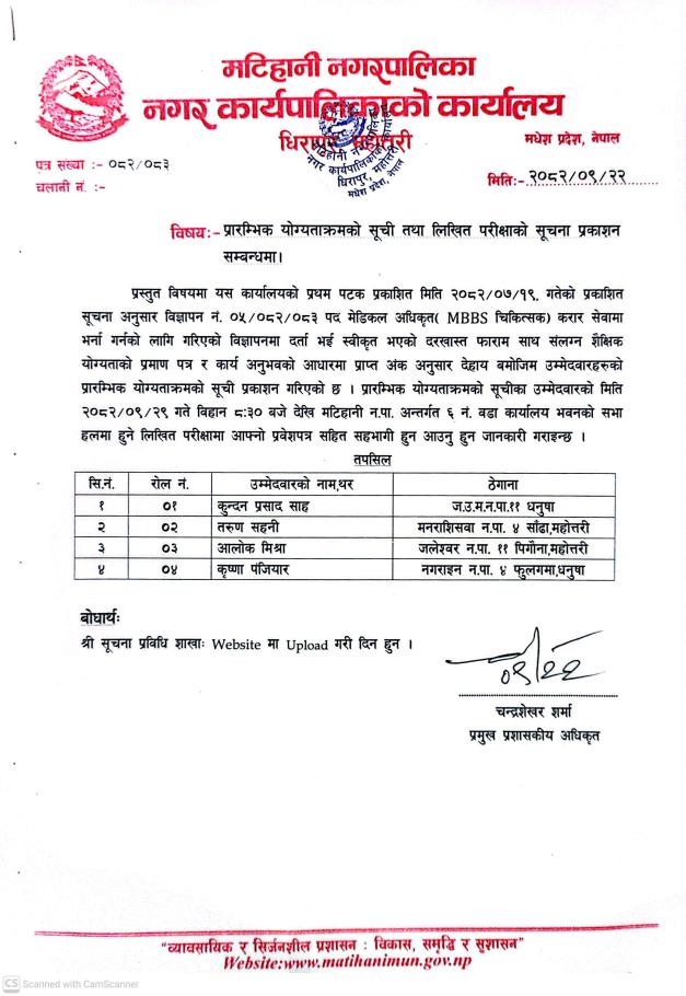 मेडिकल अधिकृत (MBBS चिकित्सक)को प्रारम्भिक योग्यताक्रमको सूची तथा लिखित परीक्षाको सूचना प्रकाशन सम्बन्धमा।