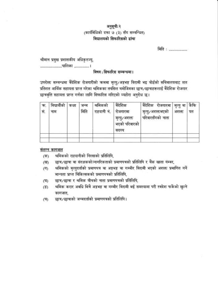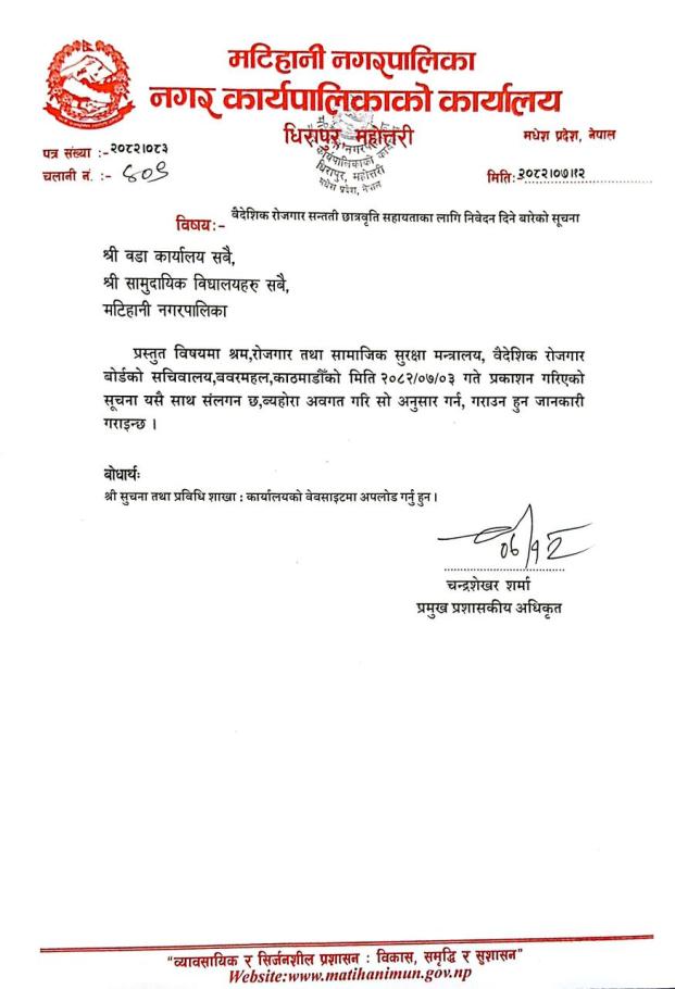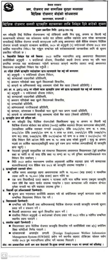 वैदेशिक रोजगार सन्तती छात्रवृति सहायताका लागि निवेदन दिने बारेको सूचना ।